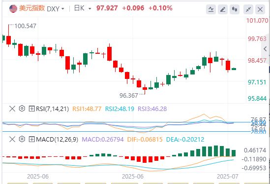 周一,由于股市走强减少了对美元的流动性需求,加之美债收益率走低,美元指数走低,下破98关口,截至目前,美元报价97.92。