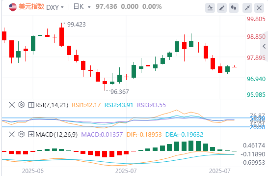 7月25日,北京时间周五亚市早盘,美元指数徘徊在97.43附近。周四,得益于美国与贸易伙伴的基金进展,美元指数结束四连跌,最终收涨0.3%,报97.5。美债收益率延续反弹趋势,基准的10年期美债收益率收报4.402%,2年期美债收益率收报3.931%。随着全球贸易紧张局势缓和的迹象抑制了对避险资产的需求,现货黄金连续第二个交易日回调,最终收跌0.55%,收报3368.66美元/盎司;现货白银围绕39美元关口震荡,最终收跌0.52%,报39.06美元/盎司。由于俄罗斯汽油出口减少的预期盖过了美国允许雪佛龙恢复在委内瑞拉开采石油的消息,国际油价反弹。WTI原油企稳在65美元关口上方,最终收涨1.12%,报65.95美元/桶;布伦特原油收涨0.75%,报68.57美元/桶。
