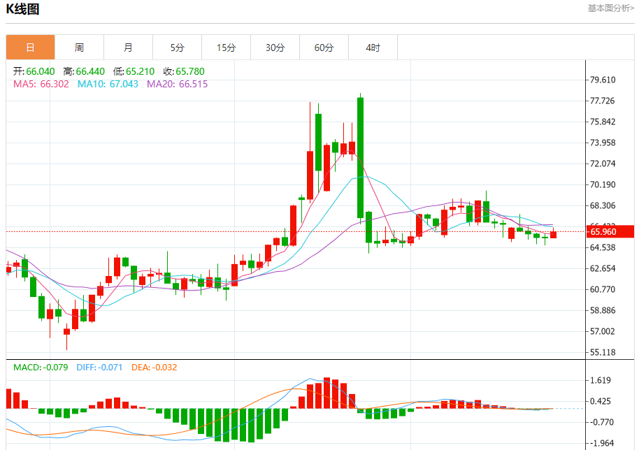 原油市场:截止北京时间20:23,美油上涨,现报65.960,涨幅1.09%。纽市盘前,(原油)价格在最后一个交易日以有限的涨幅结算,利用(RSI)上出现的积极信号,这有助于其重新测试65.60美元的关键阻力位。