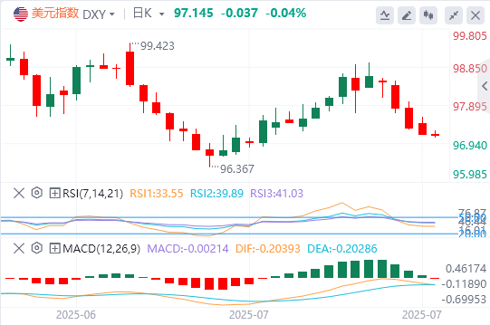 周三,随着美国与更多贸易伙伴达成协议,市场避险情绪降温。美元指数依旧疲软,截至目前,美元报价97.14。