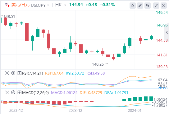继周二波澜不惊的走势之后,美元/日元在周三积聚了看涨势头,并攀升至145.00以上。日本当天早些时候公布的数据显示,日本11月份劳动现金收入环比仅增长0.2%。这一数据低于10月份的1.5%,也大大低于市场预期的1.5%。