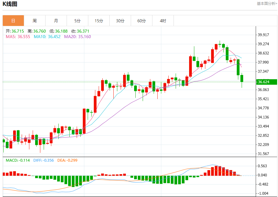 现货白银:截止北京时间20:23,现货白银下跌,现报36.613,跌幅1.30%。纽市盘前,(白银)价格在最后一交易盘中交易中加深了跌幅,受到短期看跌修正趋势占主导地位的影响,以及其沿着强化负面轨道的偏向线交易。