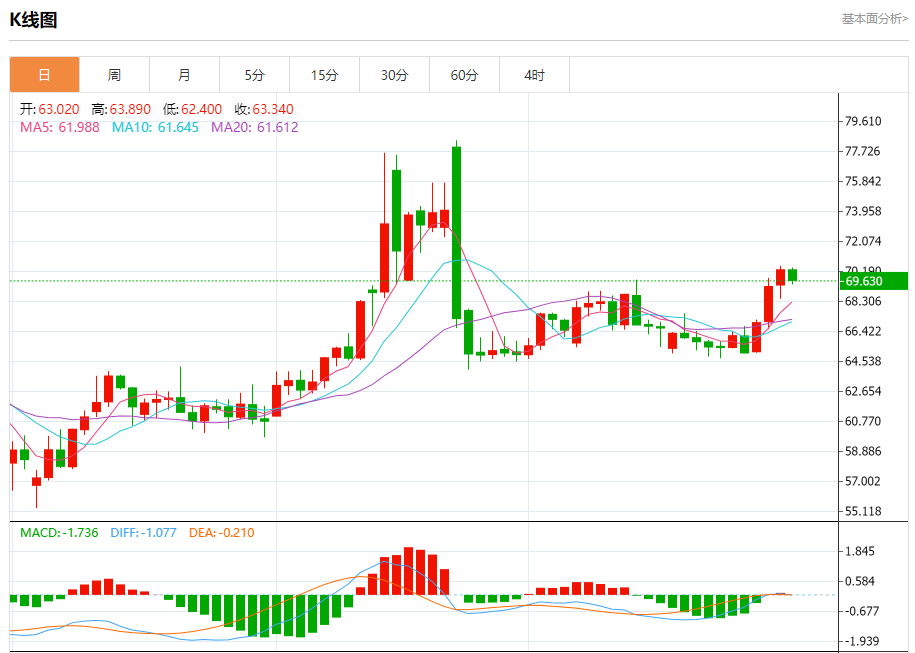 原油市场:截止北京时间20:23,美油下跌,现报69.630,跌幅0.51%。纽市盘前,(原油)价格开始复苏,在最后一盘交易中小幅上涨,此前它成功获得了积极势头并摆脱了(RSI)上明显的超买状况,为近期实现更多涨幅开辟了道路。