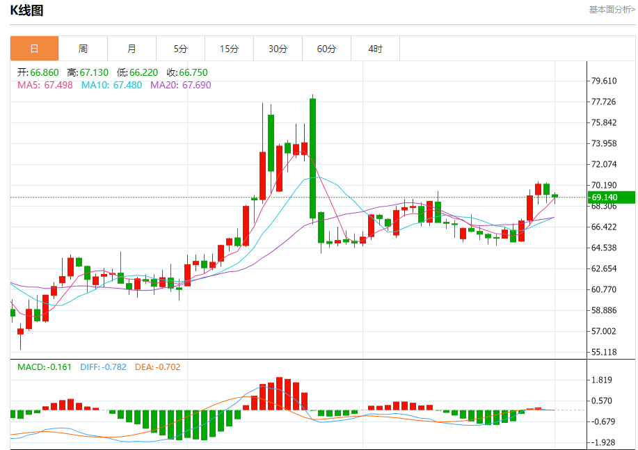 原油市场:截止北京时间20:23,美油下跌,现报69.120,跌幅0.19%。纽市盘前,(原油)价格在最后一盘中小幅上涨,利用68.45美元关键支撑位的稳定性,提供了积极的势头,并帮助价格稳定并略有反弹,试图恢复,这是在主要看涨趋势的主导地位及其交易与该趋势的支撑偏向线一起出现的,随着其在EMA50上方的交易继续支撑。