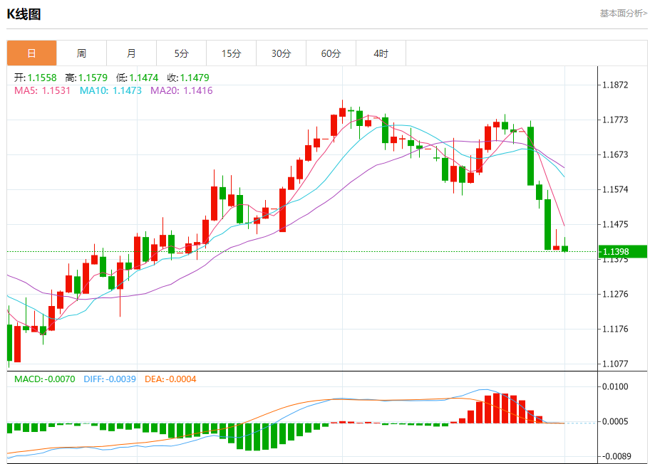 欧元/美元:截止北京时间20:23,欧元/美元下跌,现报1.1398,跌幅0.13%。纽市盘前,(欧元兑美元)盘中震荡,短期内受看跌修正波占主导地位的影响,其交投低于EMA50的负面压力仍在继续,表明看涨势头疲软。