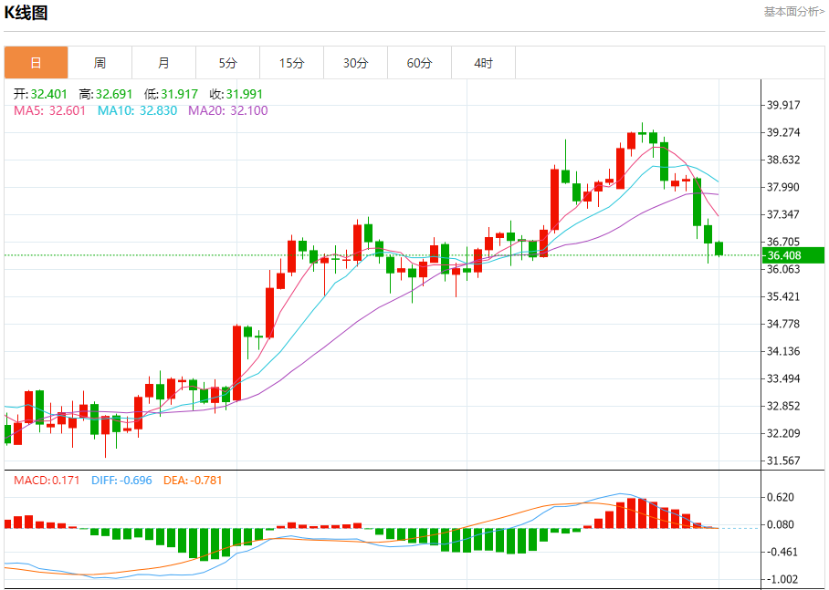 现货白银:截止北京时间20:23,现货白银下跌,现报36.394,跌幅0.79%。纽市盘前,(白银)价格在最后盘中交易中下跌,短期看跌修正趋势占主导地位,并沿着支撑这一趋势的看跌偏向线交易,准备突破关键支撑位0.3630,该支撑位是我们昨天建议的目标,价格由于其稳定性而之前达到该水平反弹走高,以减轻(RSI)上明显的超卖状况,为记录更多损失开辟道路。