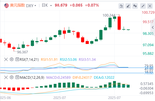 8月5日,北京时间周二亚市早盘,美元指数徘徊在98.67附近。周一,美元指数横盘震荡,最终小幅收涨0.05%,报98.708。美债收益率震荡走低,基准的10年期美债收益率收报4.197%,2年期美债收益率收报3.679%。受益于降息预期的抬升,现货黄金连续第三个交易日上涨,一度站上3380美元关口,最终收涨0.32%,收报3373.56美元/盎司;现货白银同样延长涨势,最终收涨0.99%,报37.41美元/盎司。由于OPEC+再度大幅增产抵消了市场对俄油制裁可能引发供应短缺的担忧,国际原油跌至一周低点。WTI原油低开低走,最终收跌1.47%,报65.67美元/桶;布伦特原油最终收跌1.18%,报68.53美元/桶。