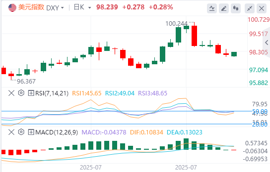 周四,随着特朗普提名临时美联储理事推升了市场的降息预期,美元指数盘中跳水,最终收跌0.13%,截至目前,美元报价98.23。