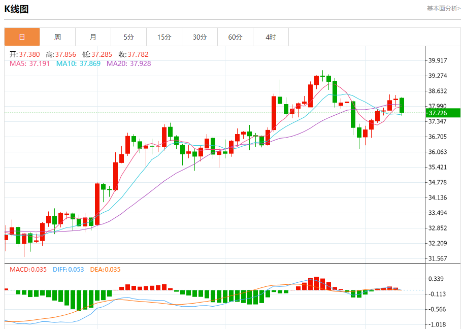 现货白银:截止北京时间20:23,现货白银下跌,现报37.726,跌幅1.50%。纽市盘前,在(RSI)出现负面信号的情况下,(白银)价格在最后一个交易日的盘中水平上下跌,试图寻找一个上涨的高点,以此作为基础,可能有助于它获得积极的动力,帮助它恢复和再次上涨,依靠其EMA50的支持,这有助于它上涨,以减少一些最后的损失,并伴随着短期的轻微看涨倾向。