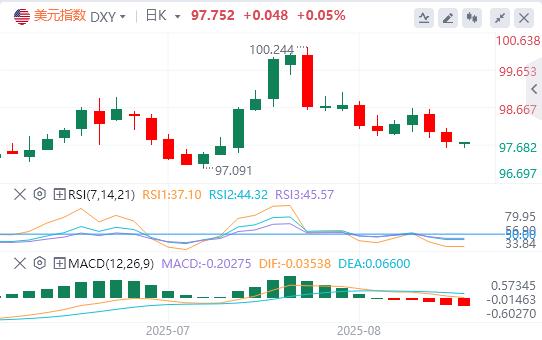因市场降息预期升温,美元指数连续第二个交易日下跌,并跌破98关口,截至目前,美元报价97.75。