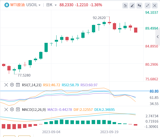 美原油:截止发稿,美原油大幅下跌,现报88.23,涨幅1.36%。欧市盘前,周二至今交投於 88.23 美元附近。由於投资人担心利率上升和石油需求前景,WTI油价中断了三周连涨的动能。美联储(Fed)上周维持利率不变并发表鹰派言论後,联准会利率将更长期处在高水准的前景为WTI油价上行空间构成阻力。值得注意的是,联准会升息会提高借贷成本,导致经济放缓并减少石油需求。此外,美元走强也是导致油价下跌的另一个因素,因为美元走强会使石油对其他货币的持有者来说成本上升,从而减少需求。