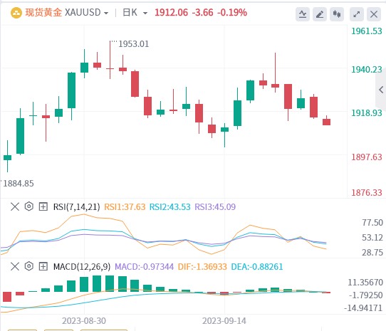 现货黄金:截止发稿,现货黄金大幅下跌,现报1912.06,跌幅0.19%。欧市盘前,金价连续第二日受到抛售压力,这也是金价在过去六日中第五日下跌,并在亚洲时段跌至一周半低点。目前,黄金/美元略低於1,915美元的水平,全天跌幅超过0.10%。