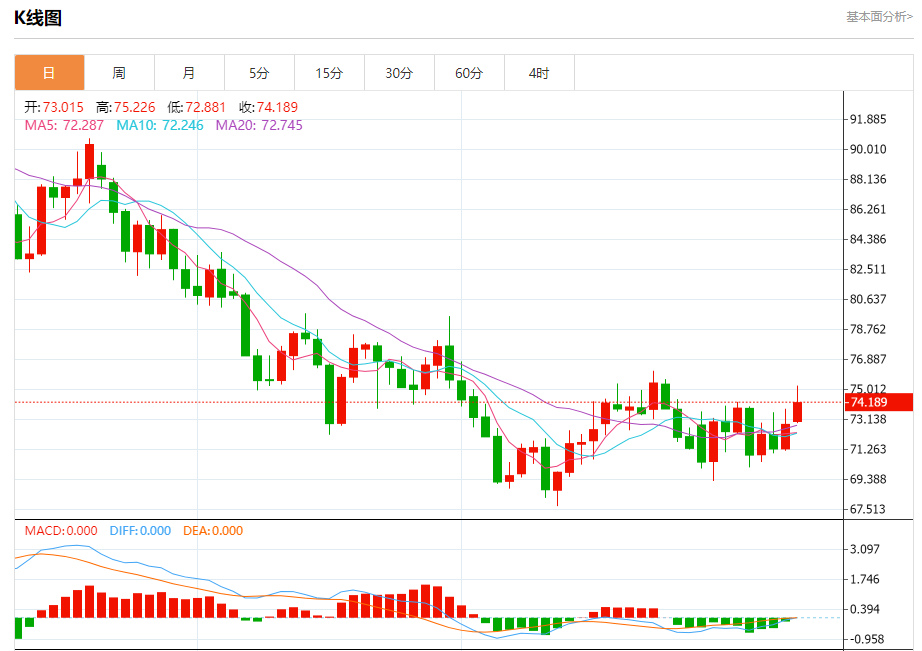 原油市场:截止北京时间21:20,美油上涨,现报74.051,涨幅1.66%。纽市盘前,原油价格明显突破73.73水平,以激活即将到来的交易中的积极情景,并为实现从75.90开始并在超过前一水平后延伸至77.86的收益开辟道路,使今天剩余时间的看涨偏见得到支持,并在EMA50上方移动,考虑到突破73.73将停止看涨趋势,并使价格再次处于负面压力下。