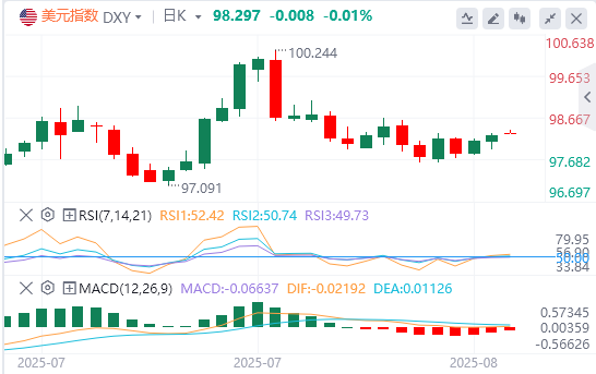 美元指数:截止发稿,美元指数徘徊在98.29美元.周二美元整体呈现分化走势,主要受本周杰克逊霍尔全球央行年会前的谨慎情绪拖累。此次会议上,美联储主席鲍威尔(JeromePowell)的讲话将为短期利率预期提供指引。由于在鲍威尔周五发表讲话前暂无重要经济数据公布,叠加此前通胀信号分化及7月疲软的就业数据推升了市场对9月降息的押注,交易员正重新调整持仓。技术面上,如果美元指数收于98.20上方,它将走向下一个阻力位99.20–99.40。