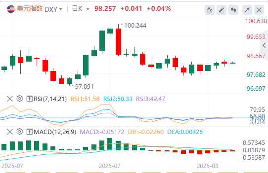 周三,美元指数先涨后跌,盘中一度升至98.42的日内高点,随后抹去日内全部涨幅并转跌,但在会议纪要显示只有两名美联储决策者支持9月降息后,美指缩减跌幅,截至目前,美元报价98.25。