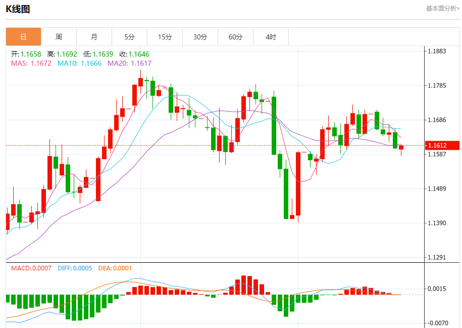 欧元/美元:截止北京时间20:23,欧元/美元上涨,现报1.1614,涨幅0.07%。纽市盘前,(欧元兑美元)在最后一盘中交易中收盘低点,受到短期小看跌浪主导地位的影响,其走势继续与该轨道的支撑偏向线一起,证实了积极势头的疲软。