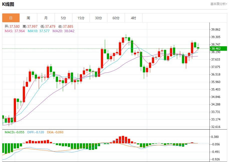 现货白银:截止北京时间20:23,现货白银下跌,现报38.408,跌幅0.35%。纽市盘前,由于当前阻力稳定在38.70美元,白银价格在最近一个交易日下跌,试图寻找一个上涨的低点,以此为基础,帮助其获得所需的看涨动力,以恢复和突破这一阻力,在短期基础上的小牛市占主导地位,并沿着这一趋势的支持性偏向线交易,在达到超卖水平后,来自EMA50上方交易的积极压力继续存在,此外(RSI)上出现积极信号。