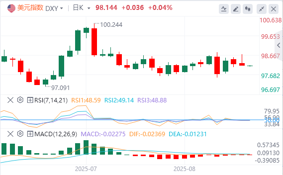 8月28日,北京时间周四亚市早盘,美元指数徘徊在98.14附近。周三,美元指数呈倒V走势,最终小幅收跌0.06%,报98.147。美债收益率普跌,基准的10年期美债收益率收报4.239%,2年期美债收益率收报3.621%。随着美联储独立性危机加剧,现货黄金连续第二个交易日走高,最终收涨0.11%,收报3397.46美元/盎司;现货白银收涨0.12%,报38.61美元/盎司。由于美国原油库存收紧缓解了投资者对供应过剩的担忧,国际原油反弹。WTI原油盘中最高触及64关口,最终收涨0.79%,报63.65美元/桶;布伦特原油最终收涨0.61%,报67.16美元/桶。