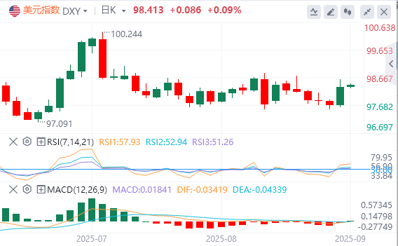 9月3日,北京时间周三亚市早盘,美元指数徘徊在98.41附近。周二,由于长期收益率上行令英镑和日元等非美货币承压,美元指数六个交易日以来首次收涨,最终收涨0.66%,报98.327。美债收益率普涨,基准的10年期美债收益率收报4.263%,对美联储政策利率敏感的2年期美债收益率收报3.652%。得益于避险情绪和降息预期的升温,现货黄金连涨六日,盘中一度逼近3540美元关口,再创历史新高,最终收涨1.64%,收报3533.43美元/盎司;现货白银涨势有所收敛,最终收涨0.37%,报40.89美元/盎司。随着美国发布最新一轮打击伊朗石油出口的制裁,且欧佩克+预计本周不会取消剩余的自愿减产,国际原油延续涨势。WTI原油维持在65美元关口上方,最终收涨1.46%,报65.37美元/桶;布伦特原油最终收涨1.38%,报69美元/桶。