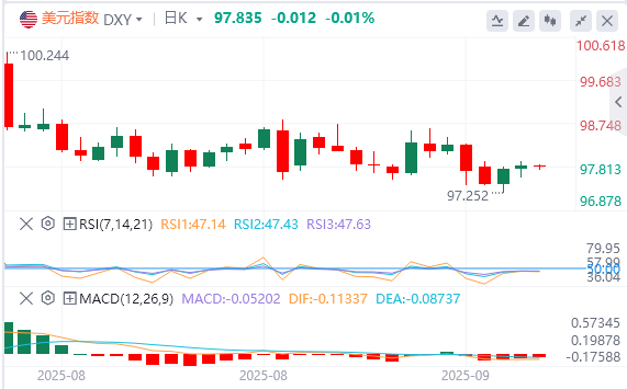 美元指数:截止发稿,美元指数徘徊在97.83美元。美元指数在PPI数据公布后震荡运行,周三收报97.83,涨幅仅0.08%,今年以来累计下跌近10%。这一疲软走势主要受累于美国贸易与财政政策的混乱,以及对美联储独立性的担忧加剧。技术面上,美元指数价格走势表明买家正在回归,因为它的交易价格略低于阻力位97.903。