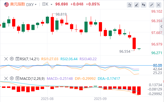 9月17日,北京时间周三亚市早盘,美元指数徘徊在96.69。周二,因投资者押注美联储本周将降息,并评估未来数月进一步货币政策宽松的可能性,美元指数跌至逾10周以来最低水平,最终收跌0.71%,报96.65。基准的10年期美债收益率收报4.0350%,对美联储政策利率敏感的2年期美债收益率收报3.5120%。现货黄金首次突破每盎司3700美元,随后短线跳水,最终收涨0.29%,收报3689.46美元/盎司;现货白银最终收跌0.38%,报42.50美元/盎司。由于乌克兰的袭击给俄罗斯石油生产造成越来越大压力,且以色列对也门港口城市荷台达发动了空袭,国际原油上涨。WTI原油最终收涨2.01%,报64.54美元/桶;布伦特原油最终收涨1.51%,报68.50美元/桶。