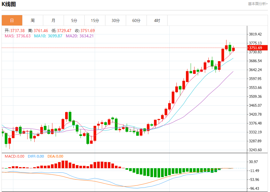现货黄金:截止北京时间20:05,现货黄金上涨,现报3751.52,涨幅0.42%。纽市盘前,(黄金)价格在最后一个交易日上涨,此前的下跌旅程旨在寻找更高的低点,以此作为支撑其复苏的基础,这是在短期内主要看涨趋势占主导地位的情况下,其交易沿着该轨道的支撑趋势线进行。