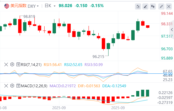 9月29日,北京时间周一亚市早盘,美元指数徘徊在98.02。上周五,因美国通胀数据符合预期,加强了市场对美联储今年晚些时候可能继续降息的押注。美元指数震荡下行,盘中一度逼近98关口,最终收跌0.28%,报98.17,周线录得两连涨。基准的10年期美债收益率收报4.176%,对美联储政策利率敏感的2年期美债收益率收报3.647%。现货黄金在美盘前大幅拉升,盘中一度冲上3780美元关口上方,但未能站稳此处,最终收涨0.31%,收报3760.53美元/盎司,周线录得6连涨;现货白银在美盘前大幅拉升,并冲上46美元上方,创逾14年新高,最终收涨1.98%,报46.06美元/盎司,周线同样与黄金录得6连涨。原油冲高回落。WTI原油在美盘时段一度涨至66.17美元的日内高点,随后大幅回落,抹去日内全部涨幅,最终收跌0.06%,报64.97美元/桶;布伦特原油最终收跌0.11%,报68.64美元/桶。
