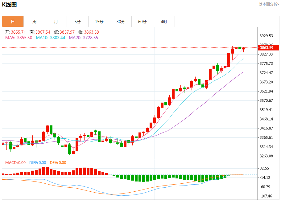 现货黄金:截止北京时间20:23,现货黄金上涨,现报3863.56,涨幅0.19%。纽市盘前,(黄金)价格继续在有限的范围内波动,倾向于在最后一个交易日的水平上行,试图获得看涨势头,这可能有助于它在近期基础上恢复创下历史新高,注意到相对强度指标上出现的积极信号,其交易在EMA50上方所代表的动态压力继续存在,在短期主要看涨趋势占主导地位的情况下加强了其复苏的机会。