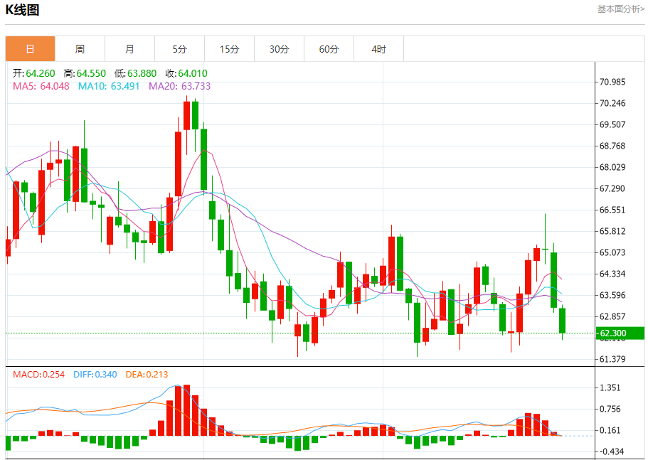原油市场:截止北京时间20:23,美油下跌,现报62.300,跌幅1.80%。纽市盘前,在相对强势指标达到超卖水平后,相对停止了损失,原油价格在最后一个盘中交易中跌至低点。随着这些超卖条件的出现,价格开始下跌,特别是随着这些指标出现积极的重叠信号。