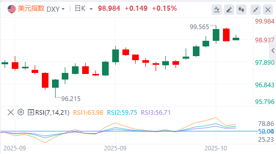 10月13日,北京时间周一亚市早盘,美元指数徘徊在98.98附近。上周五,美元指数盘中跳水,跌破99关口,最终收跌0.56%,报98.835,结束四日连涨。美债收益率全线跳涨,基准的10年期美债收益率收报4.036%,对美联储政策利率敏感的2年期美债收益率收报3.512%。随着避险情绪重新升温,现货黄金回升至4000美元/盎司上方,最终收涨0.87%,收报4010.43美元/盎司,周线录得八连阳;现货白银一度触及51美元/盎司,尾盘有所回落,最终收涨1.51%,报49.973美元/盎司。受需求前景再度蒙阴的拖累,国际原油重挫。WTI原油跌跌不休,失守58美元关口,最终收跌5.32%,报57.879美元/桶,创5个月来新低,并创6月23日以来最大单日跌幅;布伦特原油最终收跌4.48%,报62.04美元/桶。