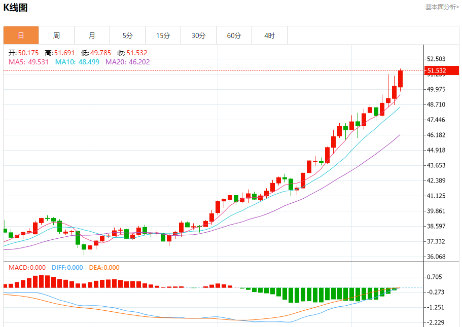 现货白银:截止北京时间20:23,现货白银上涨,现报51.530,涨幅2.51%。纽市盘前,(白银)价格在最后一个交易日的水平上波动交易,试图获得看涨势头,以支持短期主要看涨趋势的稳定性及其沿趋势线交易,除了相对强度指标上出现积极信号外,来自EMA50上方交易的积极压力仍在继续。