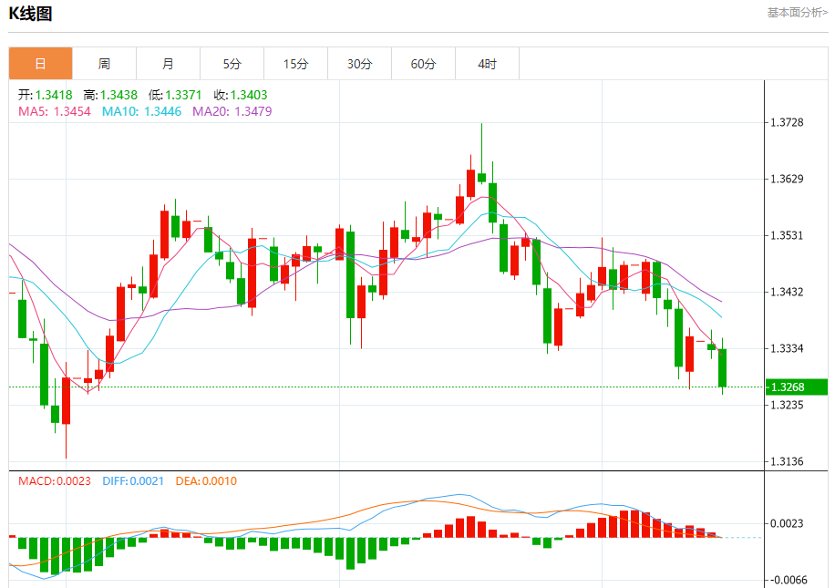 英镑/美元:截止北京时间20:23,英镑/美元下跌,现报1.3268,跌幅0.48%。纽市盘前,(GBPUSD)价格在上一次日内交易中小幅上涨,由于其交易价格低于EMA50,本受负面压力持续影响,同时相对强弱指标出现负面信号,这降低了价格在短期内回升的可能性。在短期内主要的看跌趋势占主导,且价格沿着趋势线交易。