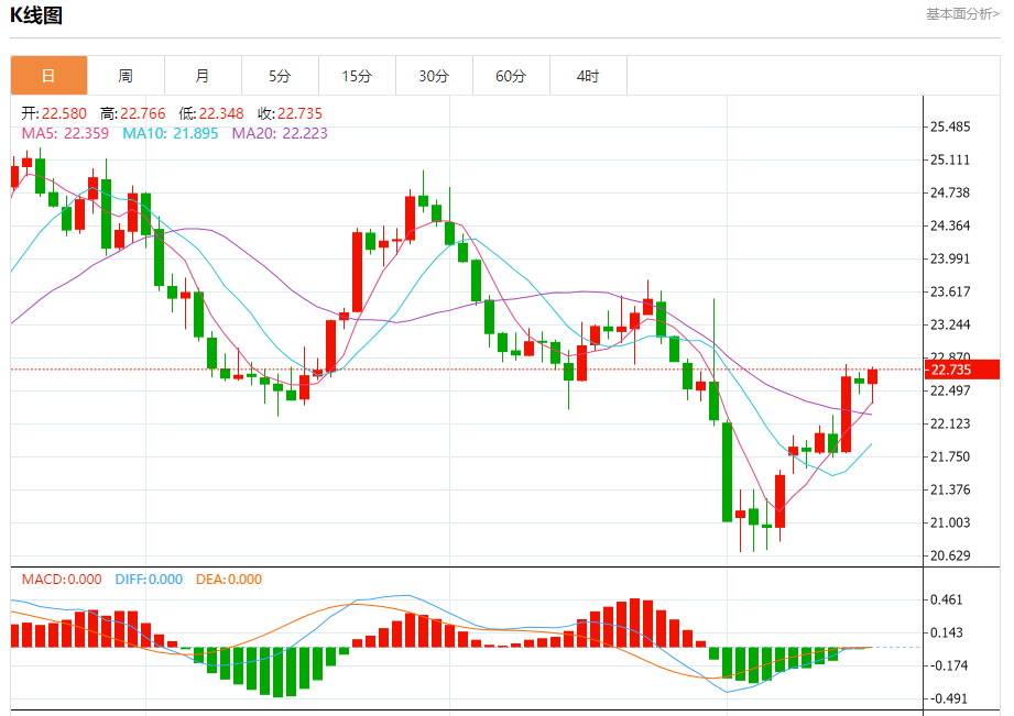现货白银:截止北京时间20:24,现货白银上涨,现报22.733,涨幅0.65%。纽市盘前,白银价格现在显示出积极的交易,以恢复今天预期的牛市轨道,这是由现在明显出现的随机积极性推动的,主要等待测试23.00水平,注意到突破它将延长牛市,在近期达到23.70区域。