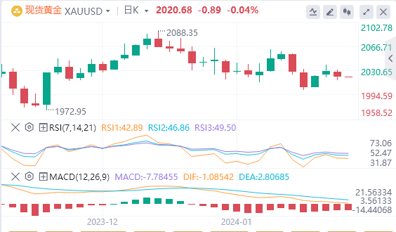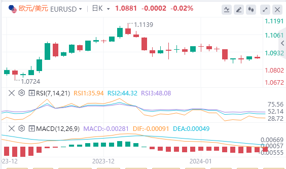 美元指数:截止发稿,美元指数交投于103.378附近。美国经济依然强劲,数据持续坚挺,表明第四季度可能增长,2024年第一季度可能保持稳定。关于美联储,市场预期已经调整,市场预计2024年将放松约125个基点(bps),而此前预期为近175个基点,1月初美元上涨。核心个人消费支出(PCE)可能会影响美联储的短期预期,并将于周五公布。技术面上,RSI处于平坦和积极的区域,暗示在当前的市场动态中采取中立立场,而不是明显倾向于买方或卖方。与MACD 的平坦绿色柱线配对,这表明美元有轻微的看涨势头在等待,尤其是因为它意味着卖方市场正在缩小。美元相对于SMA的定位提供了更详细的市场趋势图。高于 20 日均线的存在表明买家在短期内拥有基本控制权。然而,美元指数低于 100 日和 200 日均线的位置表明,从长远来看,卖家占据主导地位。