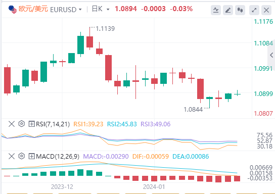 受美元广泛走强的打压,欧元/美元上周收跌。欧洲央行(ECB)行长拉加德周五在达沃斯世界经济论坛(WEF)上发表讲话时,未对近期货币政策前景发表评论,但指出欧元区和全球通胀率正在下降。周一早盘,货币对持稳于1.0900附近。
