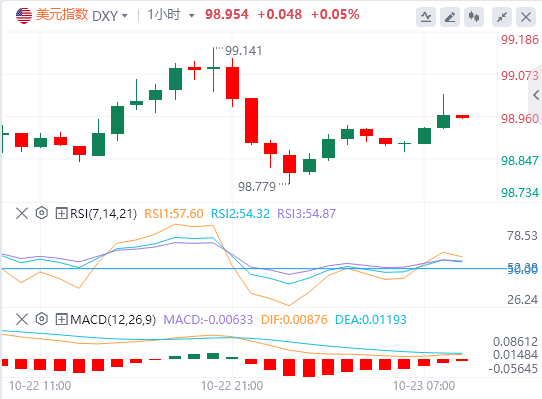 10月23日,北京时间周四亚市早盘,美元指数徘徊在98.95附近。周三,美元指数连涨三日后升势暂歇,盘中一度升破99大关,最终收跌0.08%,报98.89,创一周新低。美债收益率低位盘整,基准的10年期美债收益率最终收报3.9510%,对美联储政策利率敏感的2年期美债收益率收报3.4510%。因投资者在美国公布关键通胀数据前获利了结,现货黄金一度跌破4010美元,随后反弹至4100美元附近,最终收跌0.63%,报4098.06美元/盎司;现货白银最终收跌0.46%,报48.44美元/盎司。贝森特称将“大幅加码”对俄制裁,随后美国财政部宣布制裁两大俄油公司,国际油价大涨。WTI原油最终收涨3.13%,报59.37美元/桶;布伦特原油最终收涨4.33%,报64.36美元/桶。