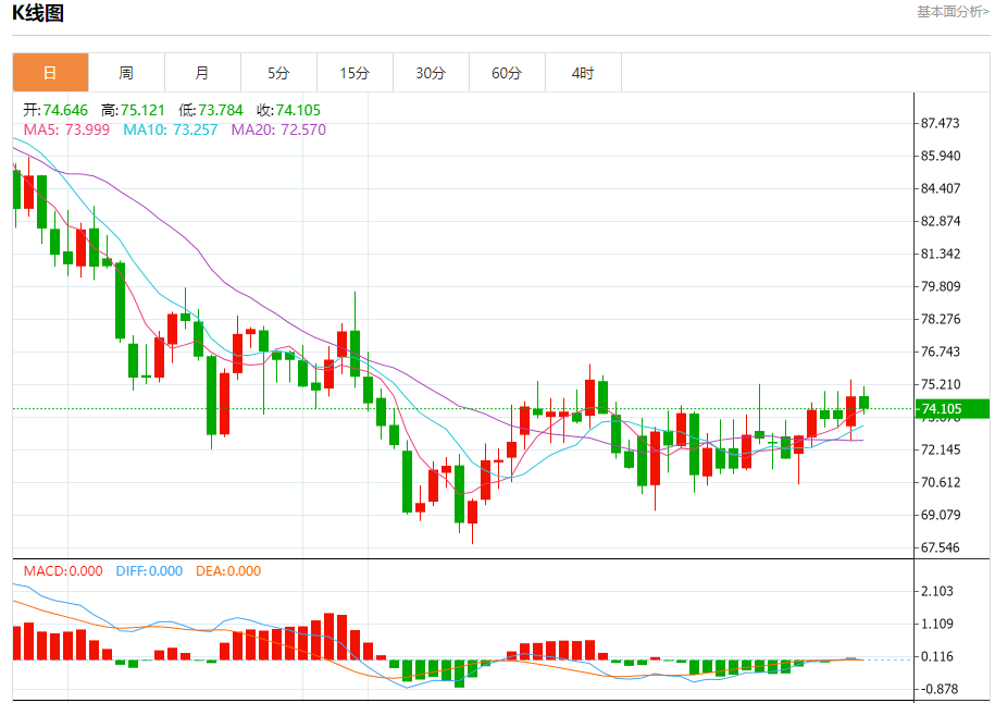 原油市场:截止北京时间21:23,美油下跌,现报74.101,跌幅0.72%。纽市盘前,自上午以来,原油价格稳定在74.50水平附近,等待聚集积极势头,以帮助推动价格恢复今天的预期看涨趋势,主要目标是77.86区域,注意到看涨通道组织了建议的看涨波,除非突破73.73,然后突破72.85水平并保持在它们下方,否则将保持有效。