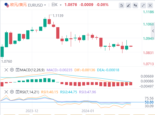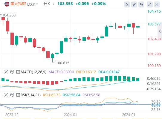 美元指数:截止发稿,美元指数交投于103.353附近。美元面临下行压力,跌至103.05。然而,强劲的经济活动数据可能会限制美元的跌幅,这可能会促使投资者推迟降息预期。周四公布的个人消费支出(PCE)数据将决定短期经济的步伐。此外,红海紧张局势的加剧也可能使美元在未来几个交易日受益。技术面上,日线图上的指标反映了移动动态。RSI出现下滑,尽管处于正值区域,但负斜率表明买盘势头一直在减弱。MACD也与这一前景一致。MACD柱状图上递减的绿色条突显了看涨势头的减弱。从SMA来看,该指数正跨越一个关键的过渡区域。它保持在20日均线上方的能力表明买家在短期内仍然占主导地位。话虽如此,该指数低于100日和200日均线,这清楚地表明长期趋势仍然有利于空头。