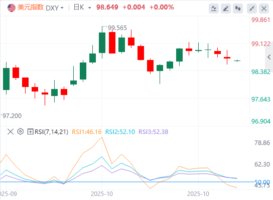 10月29日,北京时间周三亚市早盘,美元指数徘徊在98.64附近。周二,投资者关注即将到来的美联储利率决议,美元指数维持震荡,最终收跌0.08%,报98.71。基准的10年期美债收益率最终收报3.9800%,对美联储政策利率敏感的2年期美债收益率收报3.4980%。因贸易改善前景削弱了黄金的避险吸引力,现货黄金跌至三周低点,一度跌破3900美元,最终收跌0.73%,报3952.71美元/盎司;现货白银最终收涨0.13%,报47.05美元/盎司。投资者权衡对俄制裁和OPEC+增产的影响,国际油价下跌。WTI原油最终收跌2.23%,报60.05美元/桶;布伦特原油最终收跌2.77%,报63.87美元/桶。