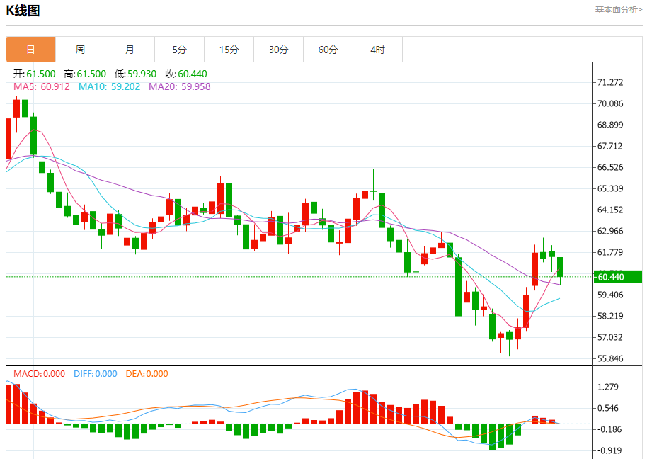 原油市场:截止北京时间20:23,美油下跌,现报60.460,跌幅1.39%。纽市盘前,(原油)价格在最后一个交易日下跌,试图寻找一个上涨的低点,以此作为基础,帮助其获得复苏所需的看涨动力,在卸载其超卖条件后,相对强度指标上出现负面信号,在EMA50上方交易所代表的动态支撑的持续中,以及在短期看涨修正趋势的主导下。