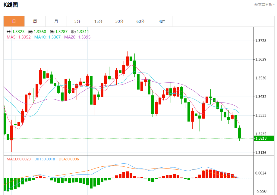 英镑/美元:截止北京时间20:23,英镑/美元下跌,现报1.3215,跌幅0.41%。纽市盘前,在最近一次日内交易中,(GBPUSD)价格大幅下跌,达到了我们预期的目标支撑位1.3265,准备在持续受到EMA50下方交易带来的负面压力中突破该支撑位,短期内主要的看跌趋势占据主导,同时价格在支撑趋势线附近交易。此外,尽管已达到超卖水平,相对强弱指标仍出现了负面信号。
