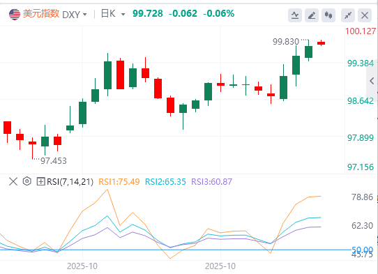 上周五,由于多名美联储官员公开表态反对美联储12月降息,美元指数持续走强,且录得7月以来最佳月度表现,截至目前,美元报价99.72。