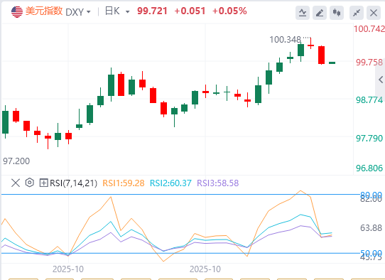 美元指数:截至发稿,美元徘徊在99.72附近。本周五将发布美国最新的非农就业人数(NFP),然而,美国历史上最长的政府关停限制了官方数据集的流通。尽管私人数据发布往往在发布之间产生波动性结果,投资者仍然默认更加关注私人数据发布。密歇根大学消费者信心和消费者通胀预期调查结果仍将在周五发布,对于错过有意义的政府级通胀和劳动指标的投资者来说,这些结果可能会变得更加重要。技术面上,如果美元指数跌破50均线99.54,它将走向最近的支撑位,即位于98.85–99.00区间。