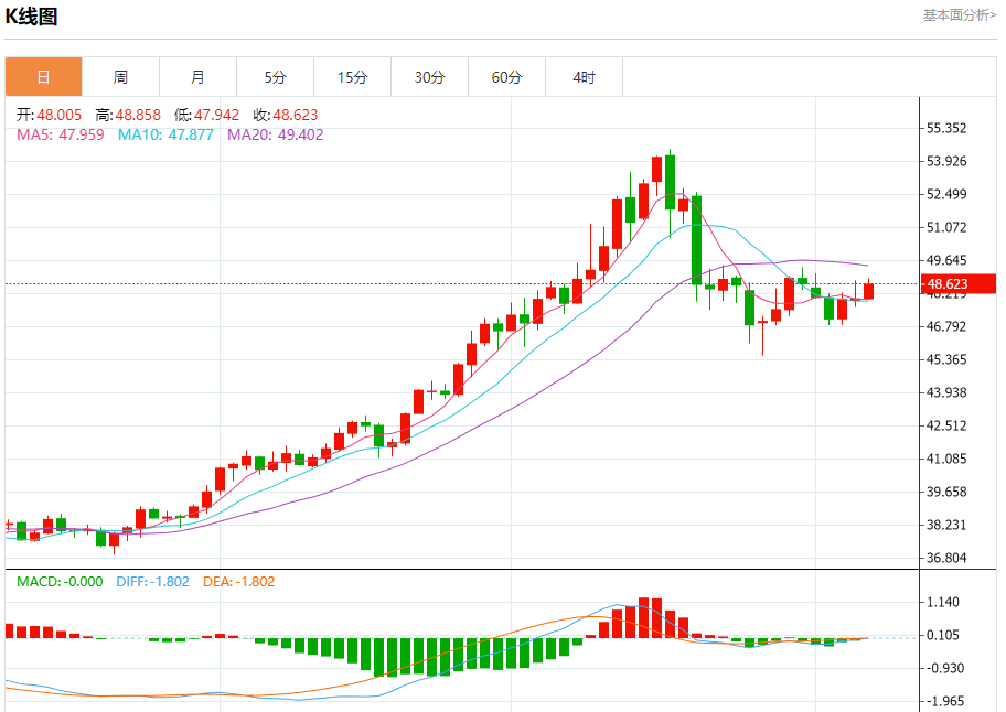 现货白银:截止北京时间21:20,现货白银上涨,现报48.615,涨幅1.29%。纽市盘前,在日内交易的最后阶段,(白银)的价格下跌,试图获得看涨动力,这可能有助于其价格回升并再次上涨。在相对强弱指标显示出积极信号占主导的情况下,由于其交易价格维持在EMA50之上,持续的正面压力加强了短期内价格回升的可能性,同时受之前短期跌势趋势线突破的影响。