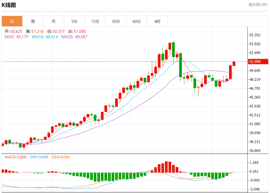 现货白银:截止北京时间21:20,现货白银上涨,现报51.087,涨幅1.22%。纽市盘前,(白银)价格在最后一个交易日继续上涨,尽管在达到超买水平后,相对强度指标上出现了负面信号,以试图摆脱这种超买状态,这表明了看涨势头的强度和数量,特别是在EMA50上方交易产生的积极压力的持续下,以及在短期基础上的小牛市波及其沿趋势线交易的主导下,强化了这一轨道。