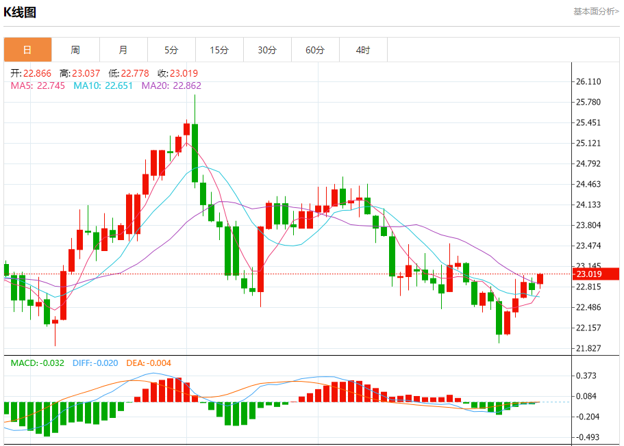现货白银:截止北京时间21:17,现货白银上涨,现报23.022,涨幅1.10%。纽市盘前,白银价格试图超过23.00水平,通过随机指标获得积极的动力,等待更多的上涨完成形成倒头肩顶形态,这将有助于推动价格向我们的主要预期目标23.70靠拢。