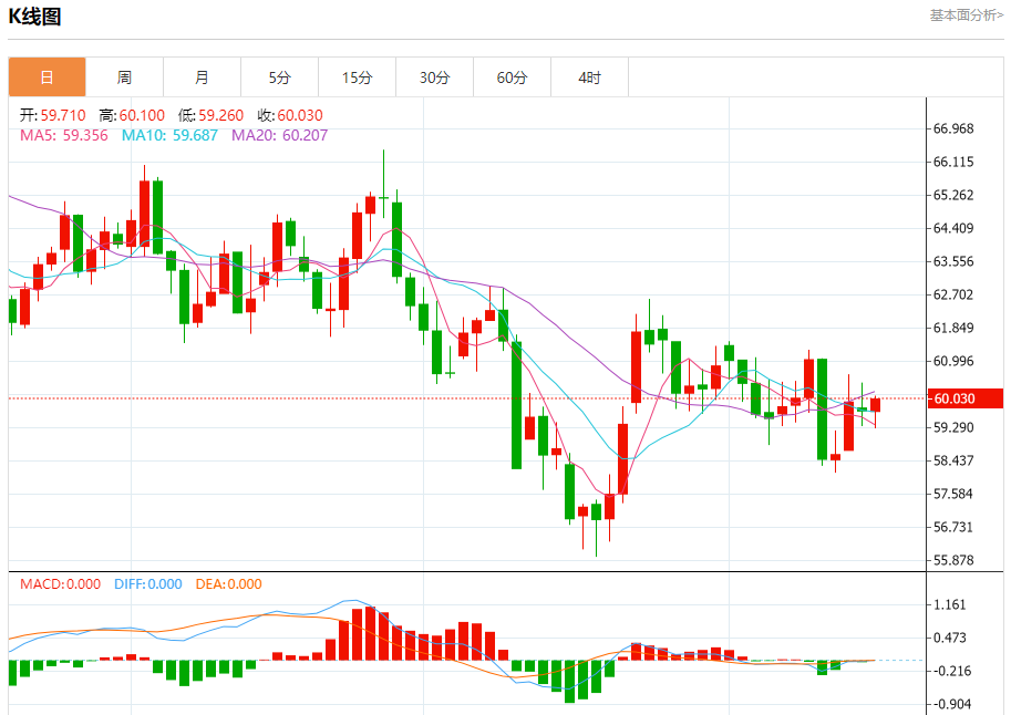 原油市场:截止北京时间21:20,美油上涨,现报60.030,涨幅0.28%。纽市盘前,(原油)价格在最后一个交易日上涨,受到相对强度指标上出现的积极信号的支持,在达到超卖水平后,接近EMA50,试图寻找其短期趋势。