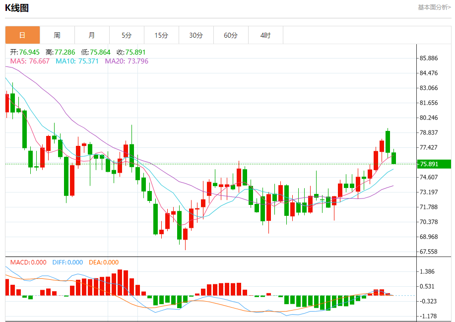 原油市场:截止北京时间21:20,美油下跌,现报75.864,跌幅1.44%。纽市盘前,原油价格在77.00附近波动,通过深入观察图表,我们发现价格形成了头肩顶模式,其确认线位于76.30,这意味着突破它将直接推动价格向我们等待的目标74.70靠拢。