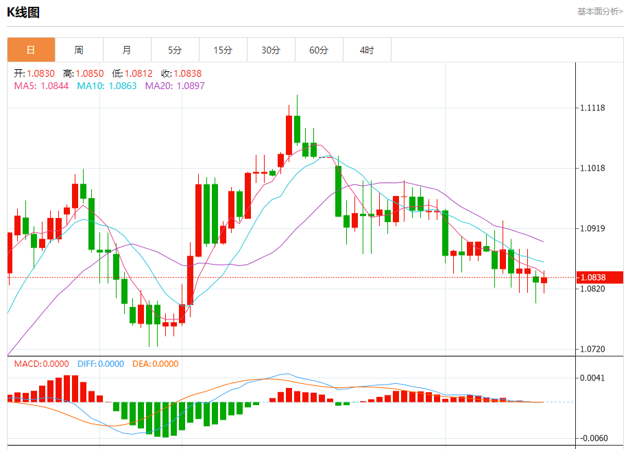 欧元/美元:截止北京时间21:20,欧元/美元上涨,现报1.0840,涨幅0.07%。纽市盘前,欧元兑美元汇率现在显示出一些暂时的看涨倾向,它可能会测试1.0860处的第一个关键阻力,然后再次转向下跌。