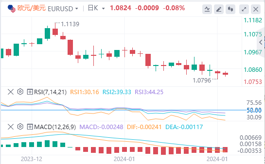 欧元/美元周一一个多月来首次跌破1.0800,但成功进行技术性修正。周二早盘,该货币对稳定在1.0800上方。预计德国经济将在第四季度以0.2%的年率萎缩,欧元区经济预计将在同一时期停滞不前。